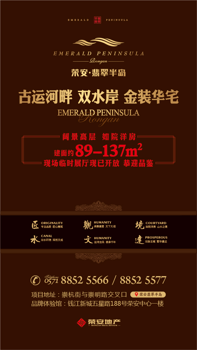 本项目推广名“荣安•翡翠半岛”,核准地名为“玉水观邸”。本宣传资料为要约邀请,相关内容不排除因政府相关规划、规定及开发商未能控制的原因而发生变化,本公司保留对宣传资料修改的权利,敬请留意最新资料。对项目周边环境、交通、教育、商业及其他配套设施的介绍,皆在提供相关信息,不意味着本公司对此作出了承诺,买卖双方的权利义务以合同约定为准。